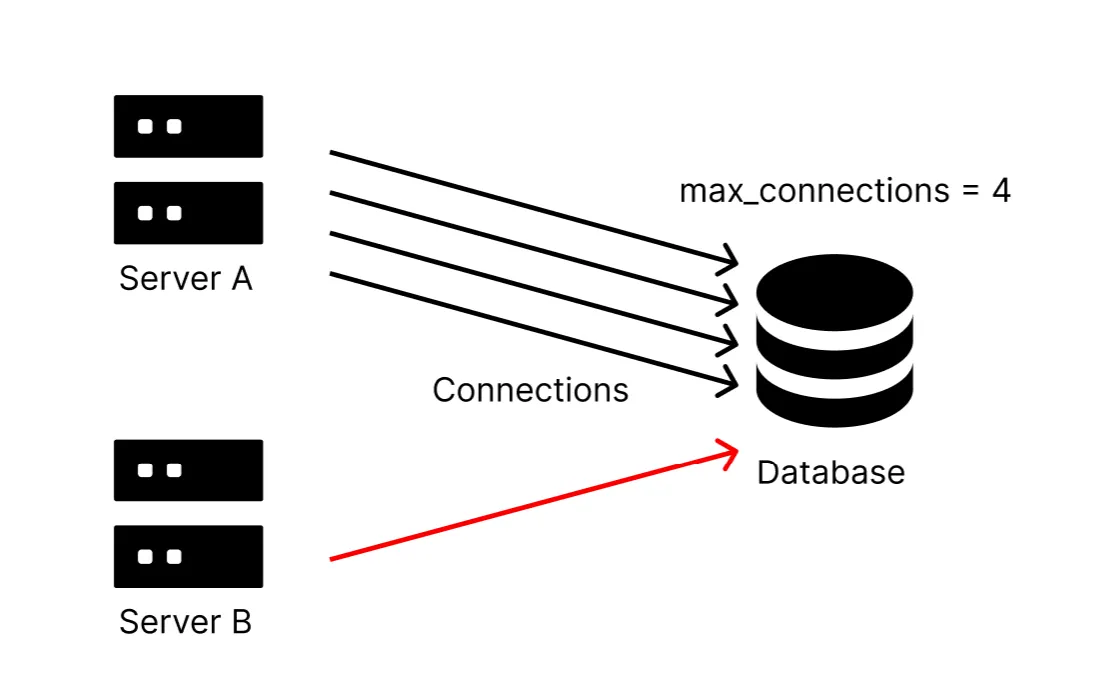 이때 백엔드 서버 A가 이미 4개의 커넥션을 다 사용하고 있다면, DB 서버는 더 이상 새로운 연결을 받아들일 수 없습니다. 이 상태에서 트래픽 증가로 인해 백엔드 서버 B를 추가로 투입하더라도, 서버 B는 DB 서버와 커넥션을 맺는 것조차 불가능한 상황에 놓이게 됩니다. 이 때문에 커넥션 풀의 크기를 설정할 때는 단일 서버 기준이 아니라, 전체 서버 수를 고려한 전역적인 관점에서 설계해야 합니다.