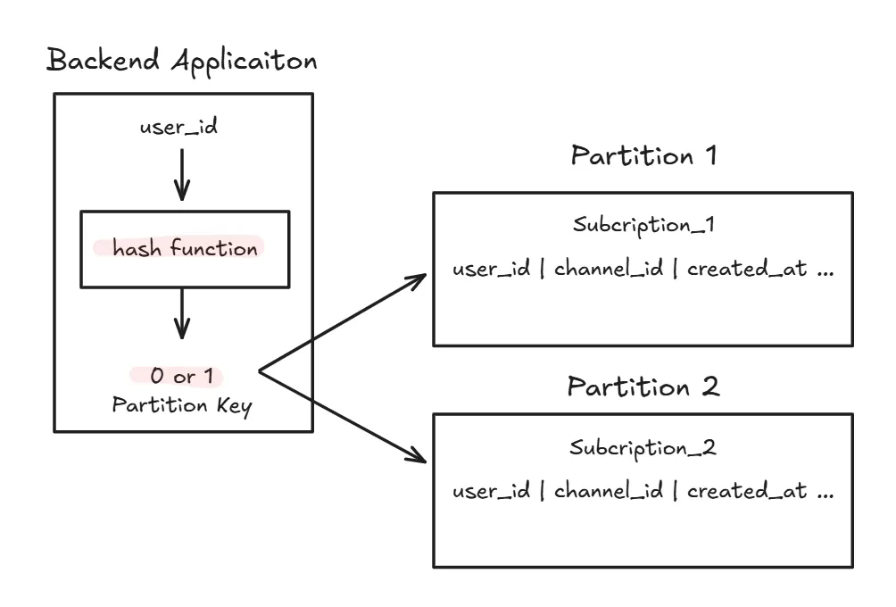 대부분의 쿼리가 user_id를 기준으로 이루어진다면 user_id를 partition key로 사용하는 것은 합리적인 선택이다. 하지만 만약 “이 채널을 구독한 유저 목록”처럼 channel_id 기준 조회가 자주 발생한다면 이야기가 달라진다. user_id를 기준으로 파티셔닝된 상태에서는, 특정 channel_id에 대한 정보를 얻기 위해 모든 파티션을 조회해야 하는 상황이 발생할 수 있다. 이는 파티셔닝을 하지 않았을 때보다 오히려 성능이 더 나빠질 수도 있다.