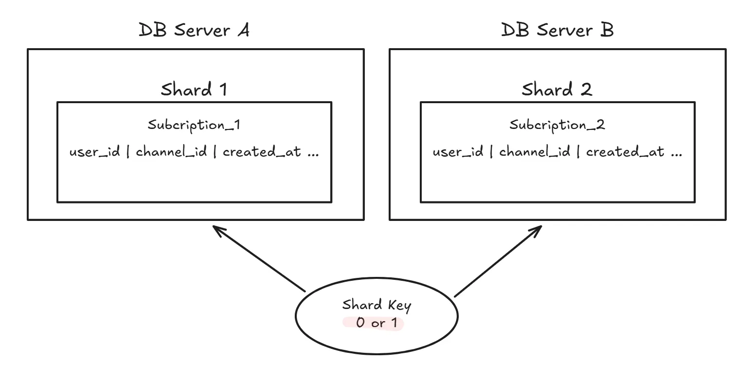 이 문제를 해결하기 위해 가장 흔히 사용하는 방식이 Hash 기반 Horizontal Partitioning이다. 예를 들어 user_id를 기준으로 해시 함수를 적용해, 그 결과에 따라 테이블을 subscription_0, subscription_1 같은 여러 테이블로 나누는 방식이다. 같은 user_id는 항상 같은 테이블에 저장되기 때문에, 특정 유저의 구독 정보를 조회할 때 어느 테이블을 조회해야 하는지도 명확해진다.