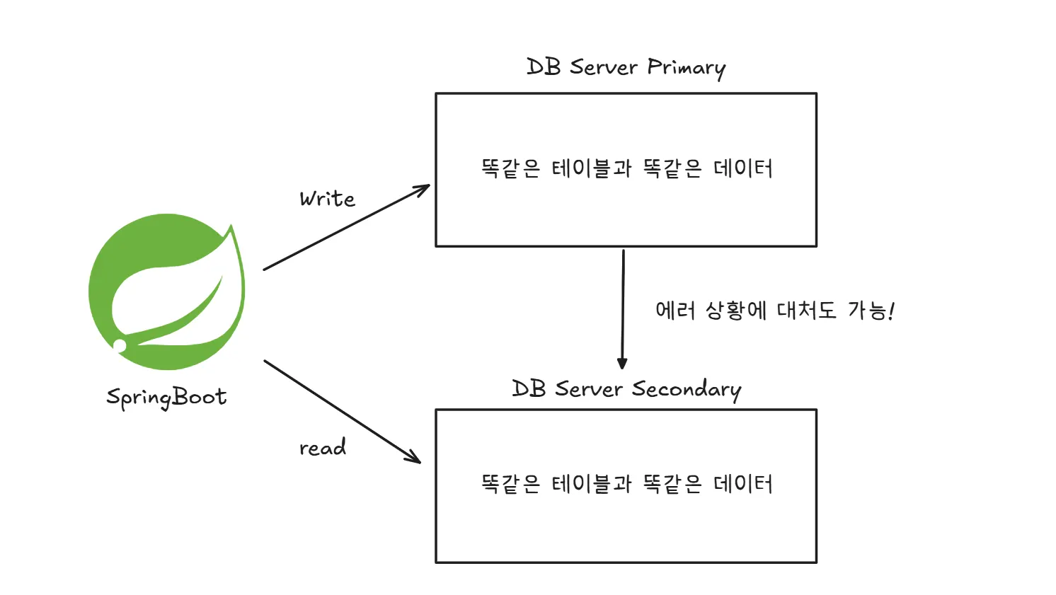 write 요청은 Primary로 보내고, read 요청은 Replica로 보내는 것뿐이다. 데이터 변경 내용을 Replica에게 전달하고, 테이블 상태를 동일하게 유지하는 책임은 전적으로 DB 서버 간 통신에 있다.
