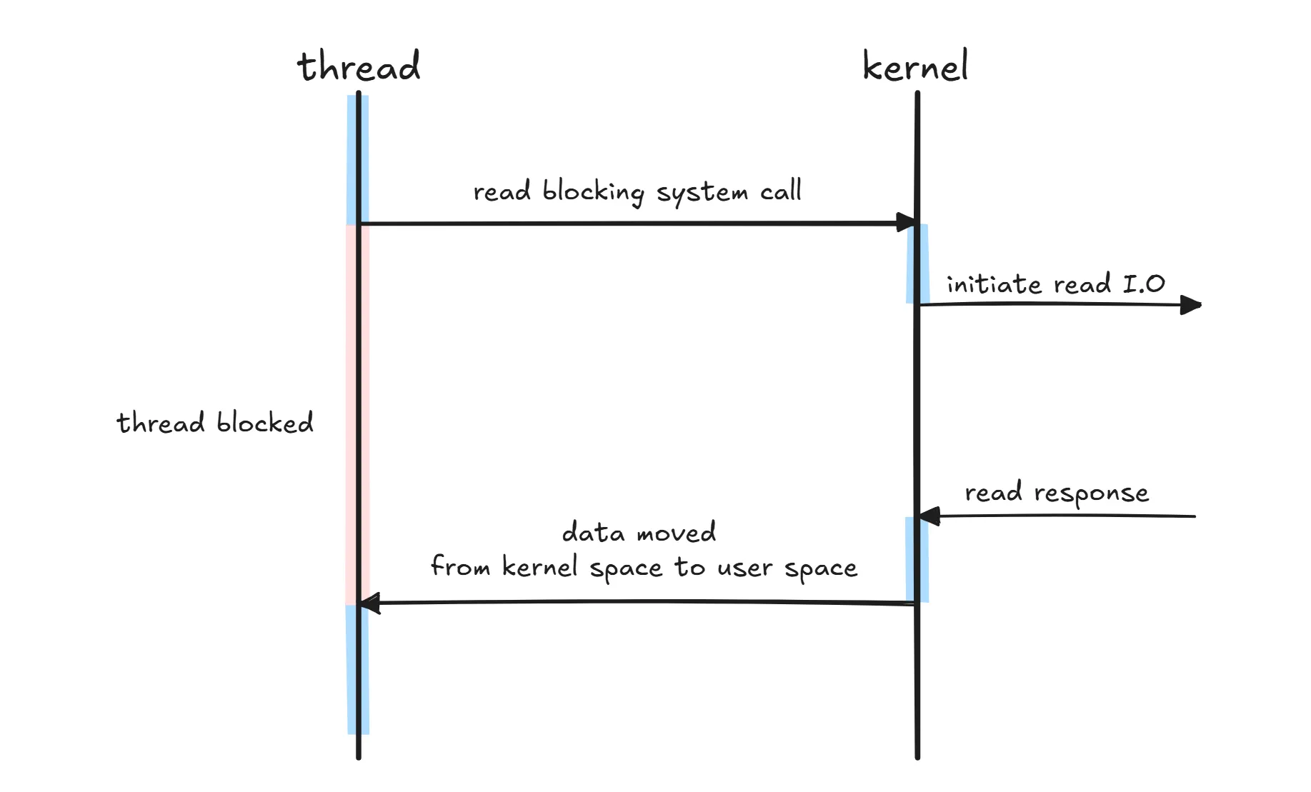 동작 과정을 살펴보면 다음과 같다. 스레드가 read blocking system call을 호출하면, 즉시 block 상태로 전환되어 실행을 멈춘다. 이후 커널(Kernel)이 I/O 작업을 시작(initiate read I/O)하고, 데이터 준비가 완료되면 응답(read response)을 반환한다. 이 과정에서 데이터는 커널 공간(Kernel Space)에서 사용자 공간(User Space)으로 복사(data moved)되며, 이 복사가 완료된 이후에야 스레드는 다시 실행 상태로 돌아가 다음 작업을 수행할 수 있다.