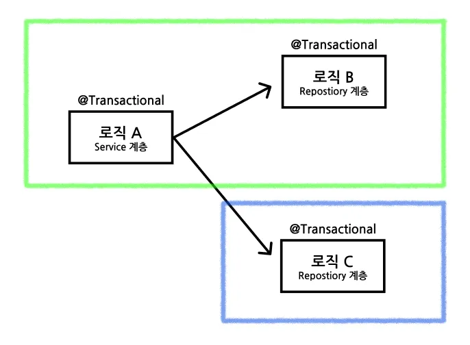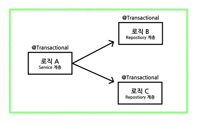 트랜잭션의 대표적인 예로 자주 언급되는 송금 기능을 살펴보자. 먼저 로직 A가 송금을 처리하면서 새로운 트랜잭션을 시작한다. 이후 실행되는 레포지토리 계층의 메서드들도 모두 이 트랜잭션에 포함된다. 이어서 로직 C가 단순히 로그를 저장하더라도, 전파 속성이 기본값(REQUIRED)이라면 별도의 트랜잭션을 만들지 않고 기존 물리 트랜잭션에 함께 묶여 실행된다.