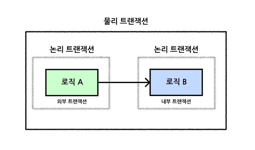 그림을 통해 다시 보자면 로직 A가 실행되고, 그 안에서 로직 B가 호출되며 두 메서드 모두 @Transactional이 적용되어 있다고 하자. 먼저 시작된 트랜잭션을 외부 트랜잭션, 그 안에서 실행되는 추가 @Transactional을 내부 트랜잭션이라 부른다. 내부 트랜잭션은 겉으로는 독립적인 것처럼 보이지만, 실제로는 동일한 물리 트랜잭션을 공유한다(기본 전파 REQUIRED). 따라서 내부 트랜잭션에서 예외가 발생하면 외부 트랜잭션까지 함께 영향을 받아, 최종적으로 전체 물리 트랜잭션이 롤백된다.