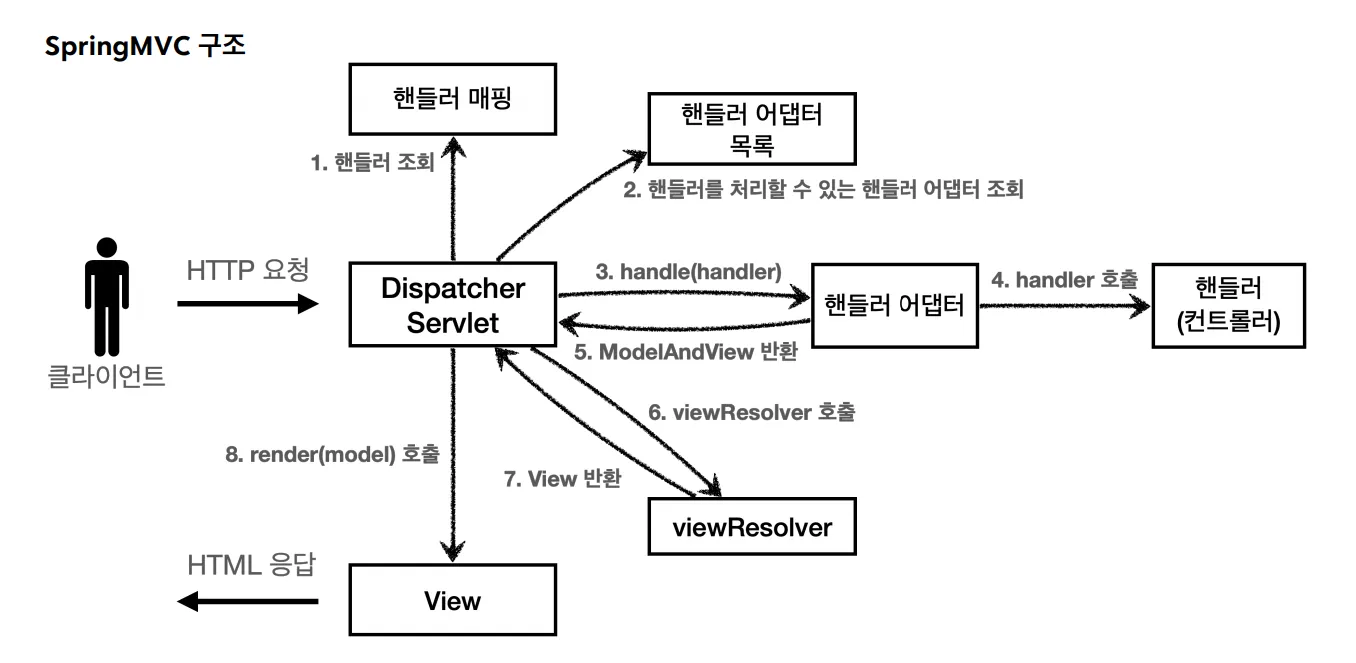 우선 DispatcherServlet이라는 것이 등장한다. DispatcherServlet은 스프링 MVC의 프론트 컨트롤러(Front Controller) 역할을 담당하며, HTTP 요청이 들어오면 가장 먼저 DispatcherServlet이 이를 받는다.
